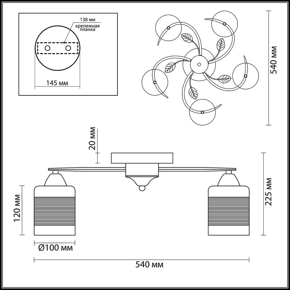 Производитель светильника рекомендует для устройства 5 ламп накаливания с цоколем E27 и мощностью 60 W, что позволит осветить помещение площадью 16,7 кв.м. Габариты изделия: высота – 230 мм, диаметр – 520 мм.