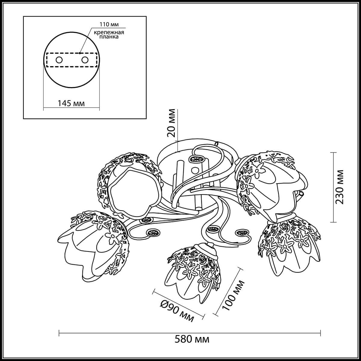 Производитель светильника рекомендует для устройства 5 ламп накаливания с цоколем E14 и мощностью 40 W, что позволит осветить помещение площадью 11,1 кв.м. Габариты изделия: высота – 200 мм, диаметр – 440 мм.