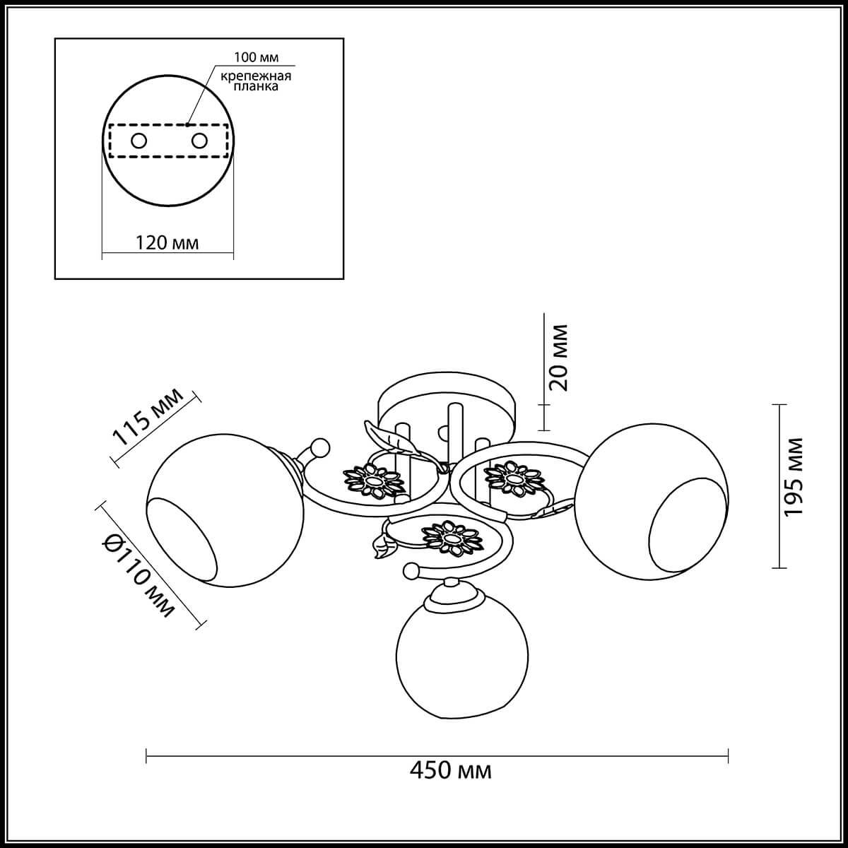 Производитель светильника рекомендует для устройства 3 лампы накаливания с цоколем E14 и мощностью 40 W, что позволит осветить помещение площадью 6,7 кв.м. Габариты изделия: высота – 200 мм, диаметр – 480 мм.