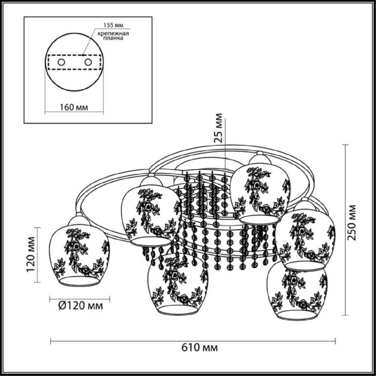 Производитель светильника рекомендует для устройства 6 ламп накаливания с цоколем E14 и мощностью 60 W, что позволит осветить помещение площадью 20 кв.м. Габариты изделия: высота – 200 мм, диаметр – 660 мм.