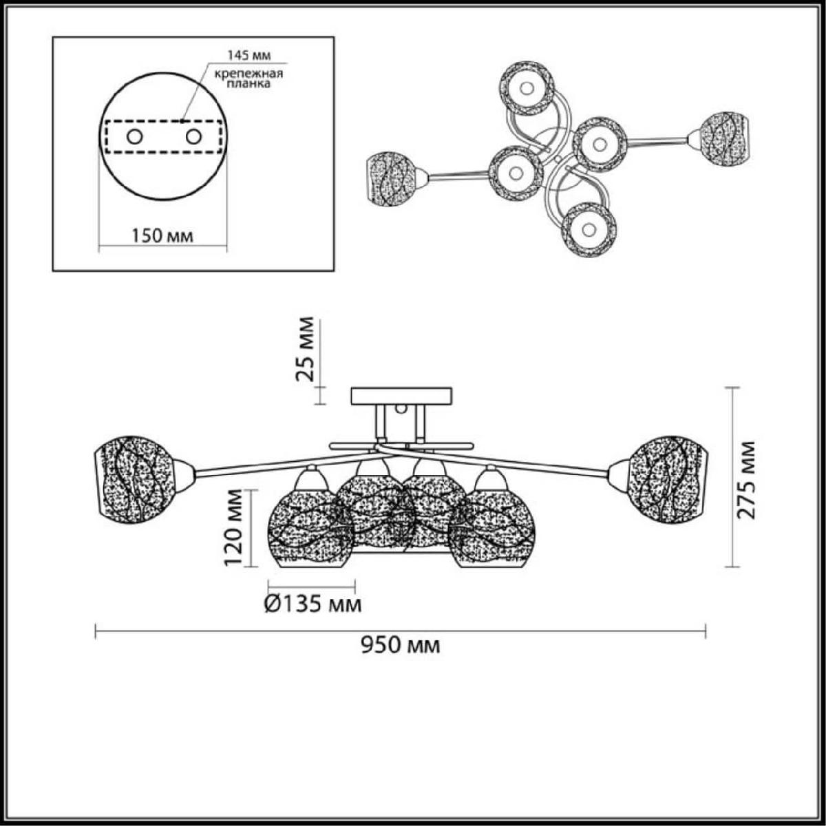 Производитель светильника рекомендует для устройства 6 ламп накаливания с цоколем E14 и мощностью 60 W, что позволит осветить помещение площадью 20 кв.м. Габариты изделия: высота – 270 мм, диаметр – мм.