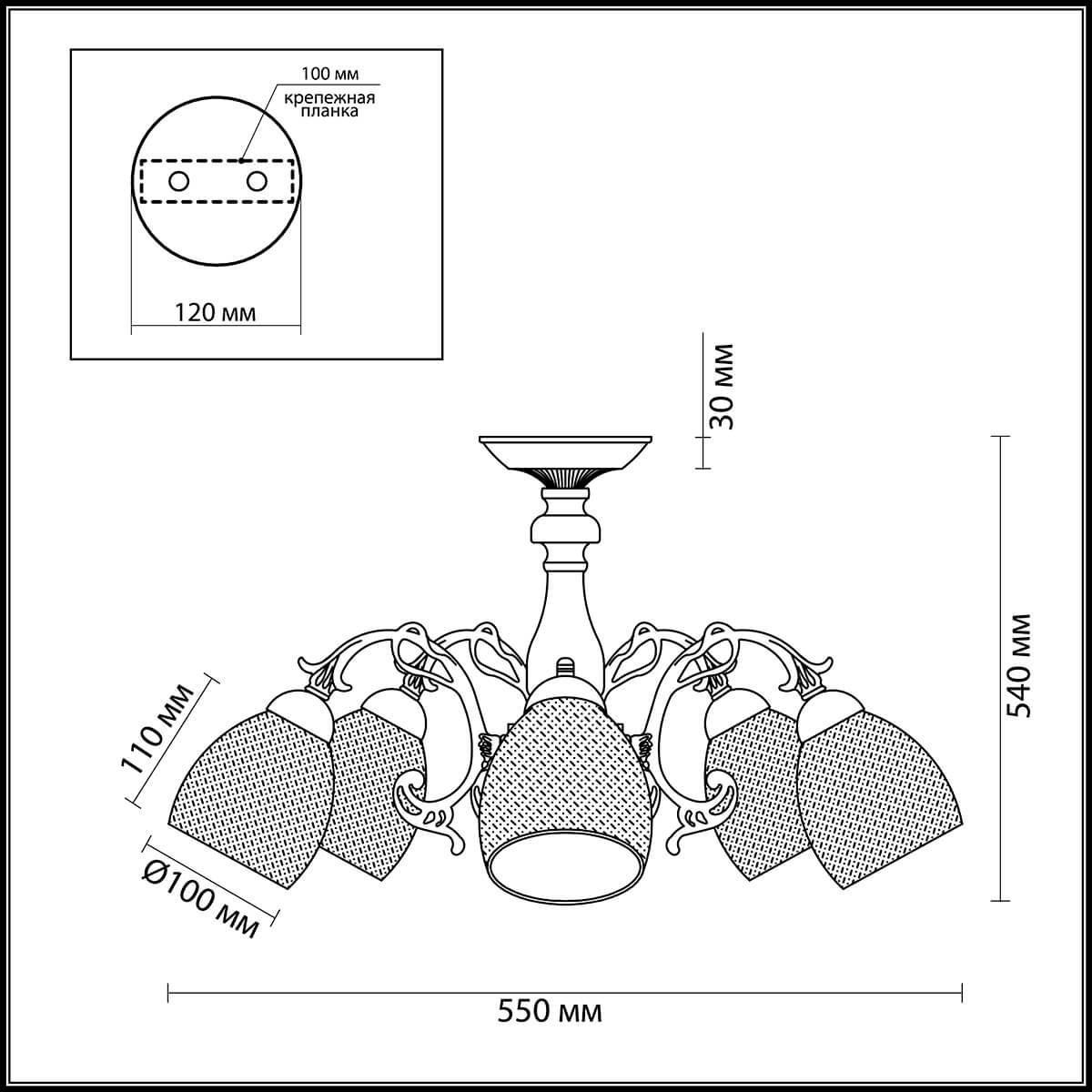 Производитель светильника рекомендует для устройства 5 ламп накаливания с цоколем E14 и мощностью 40 W, что позволит осветить помещение площадью 11,1 кв.м. Габариты изделия: высота – 310 мм, диаметр – 540 мм.