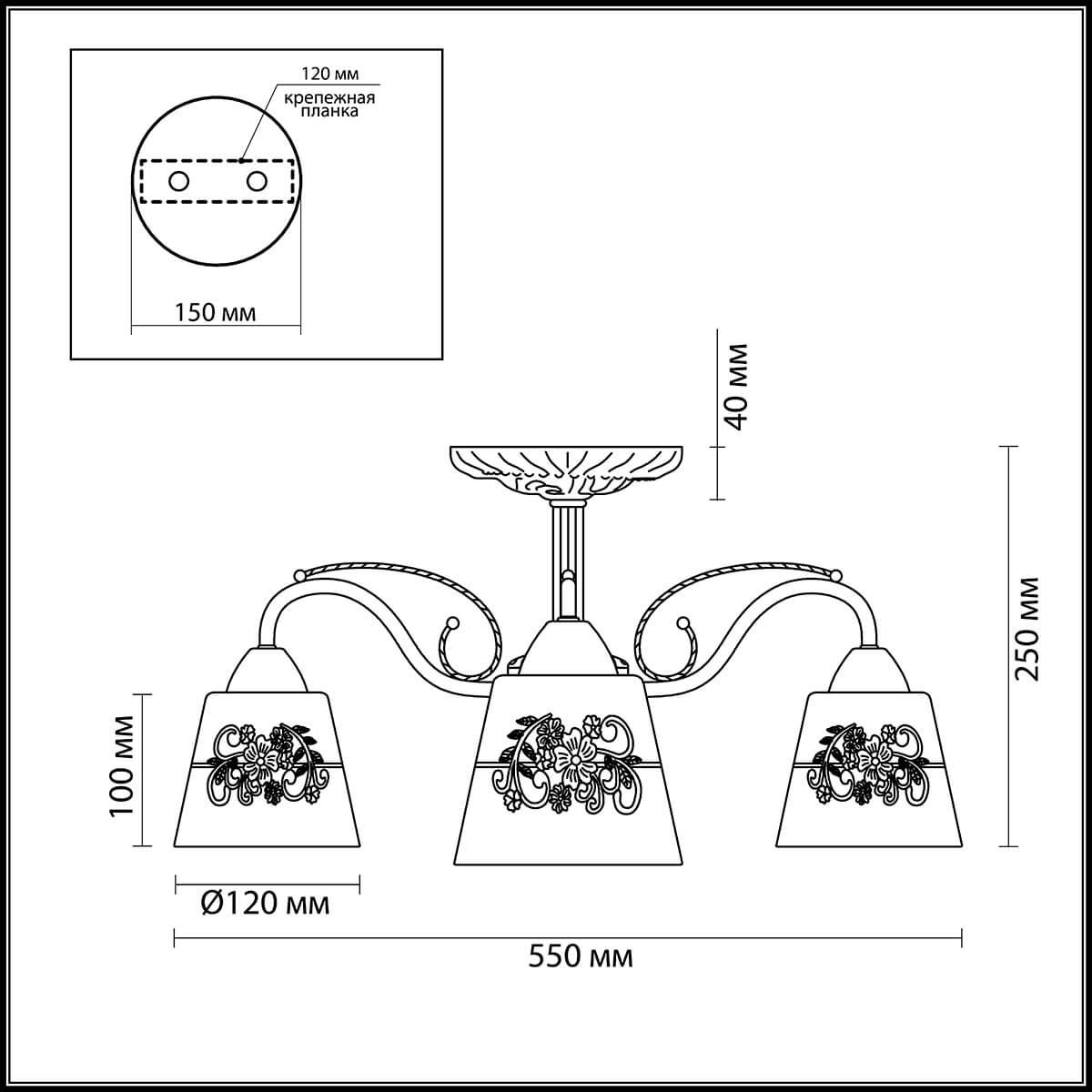 Производитель светильника рекомендует для устройства 3 лампы накаливания с цоколем E14 и мощностью 40 W, что позволит осветить помещение площадью 6,7 кв.м. Габариты изделия: высота – 260 мм, диаметр – 510 мм.