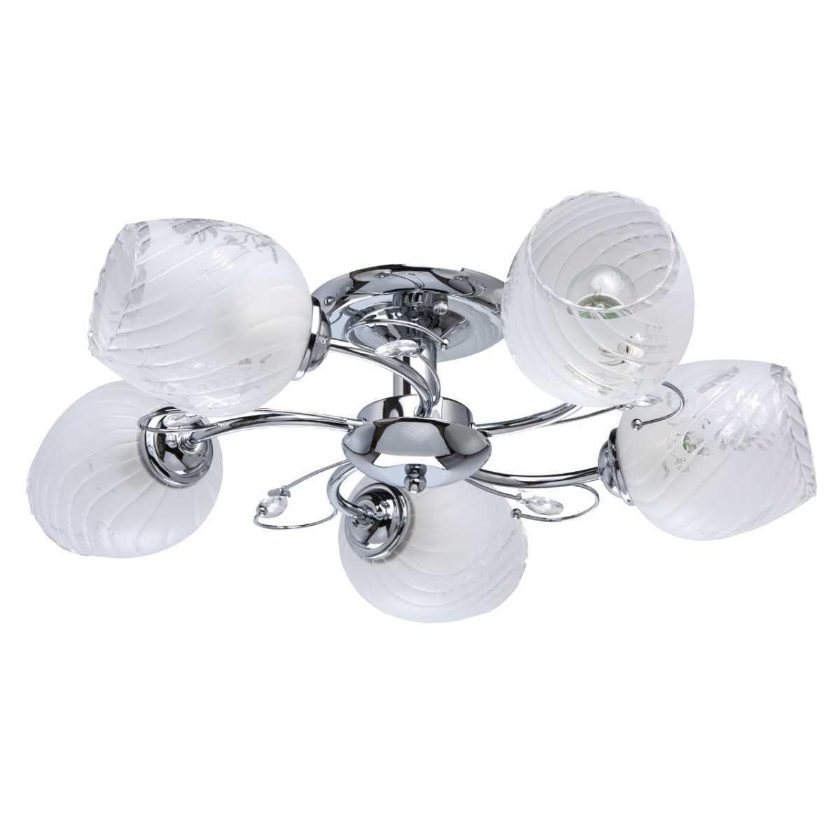 Производитель светильника рекомендует для устройства 5 ламп накаливания с цоколем E27 и мощностью 60 W, что позволит осветить помещение площадью 17 кв.м. Габариты изделия: высота – 140 мм, диаметр – 570 мм.