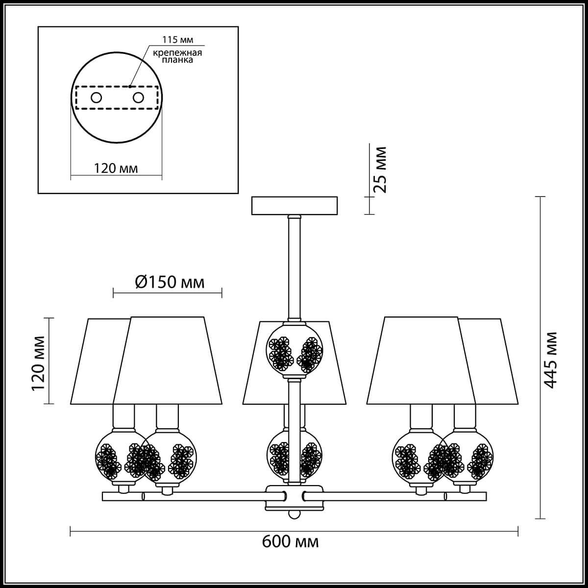 Производитель светильника рекомендует для устройства 5 ламп накаливания с цоколем E14 и мощностью 40 W, что позволит осветить помещение площадью 11,1 кв.м. Габариты изделия: высота – 450 мм, диаметр – 630 мм.