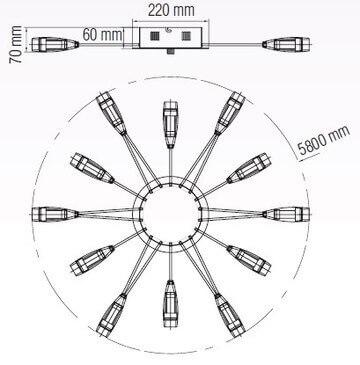 Производитель светильника рекомендует для устройства светодиодных ламп с цоколем LED и мощностью 62 W, что позволит осветить помещение площадью 31 кв.м. Габариты изделия: высота – 70 мм, диаметр – 580 мм.