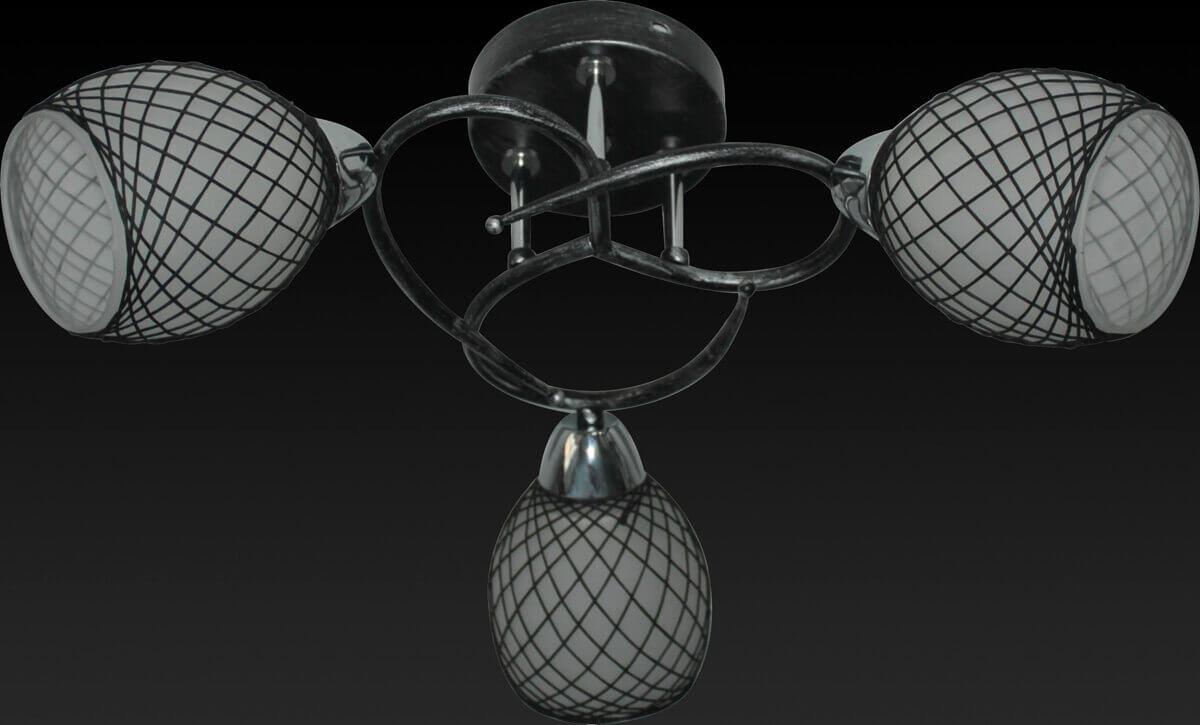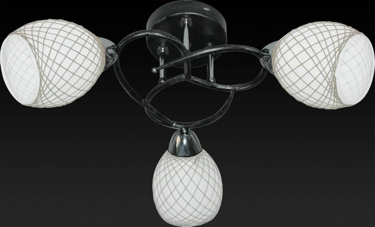 Производитель светильника рекомендует для устройства 3 лампы накаливания с цоколем E14 и мощностью 40 W, что позволит осветить помещение площадью 6,7 кв.м. Габариты изделия: высота – 220 мм, диаметр – 520 мм.