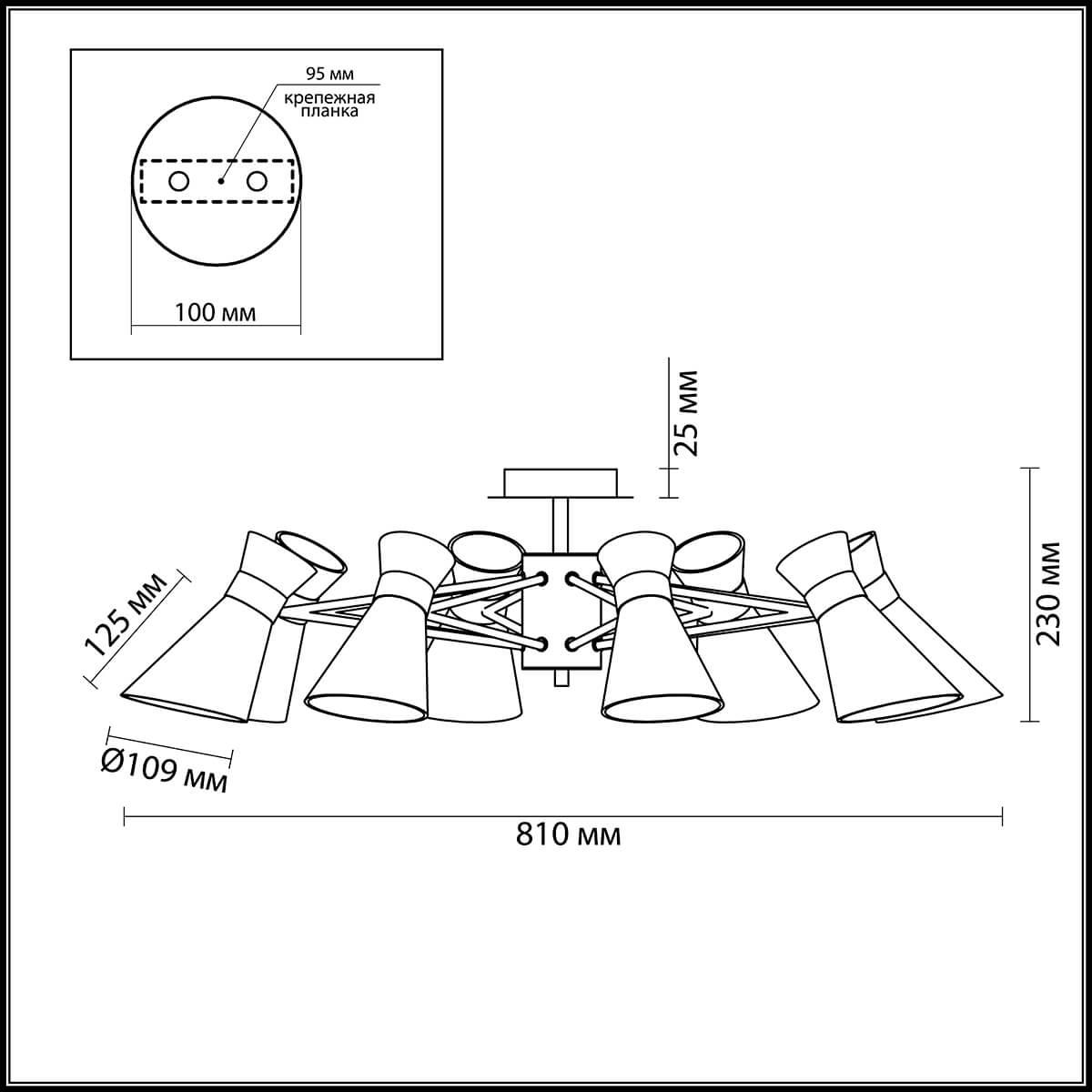 Производитель светильника рекомендует для устройства 8 ламп накаливания с цоколем E14 и мощностью 40 W, что позволит осветить помещение площадью 17,8 кв.м. Габариты изделия: высота – 230 мм, диаметр – 810 мм.