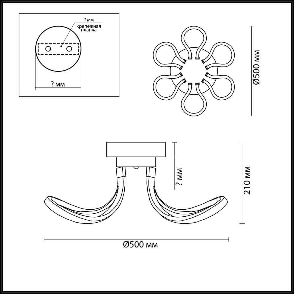 Производитель светильника рекомендует для устройства светодиодных ламп с цоколем LED и мощностью 12 W, что позволит осветить помещение площадью кв.м. Габариты изделия: высота – 210 мм, диаметр – 500 мм.