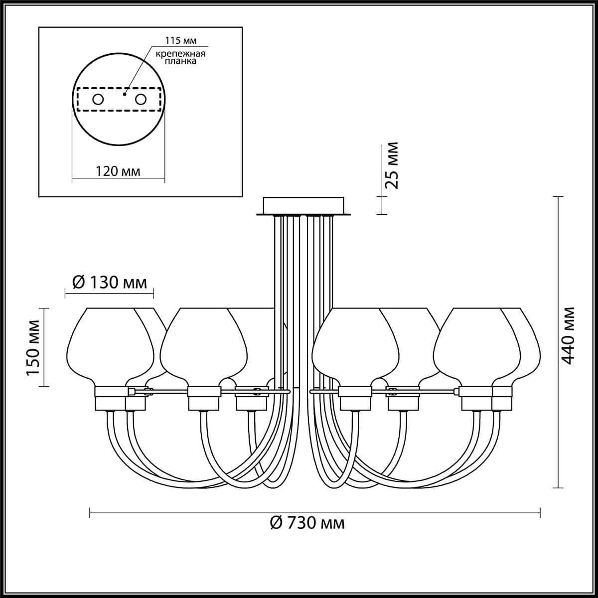 Производитель светильника рекомендует для устройства 8 ламп накаливания с цоколем E14 и мощностью 40 W, что позволит осветить помещение площадью кв.м. Габариты изделия: высота – 440 мм, диаметр – 730 мм.