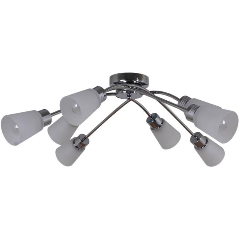 Производитель светильника рекомендует для устройства 8 ламп накаливания с цоколем E14 и мощностью 40 W, что позволит осветить помещение площадью 64 кв.м. Габариты изделия: высота – 230 мм, диаметр – мм.