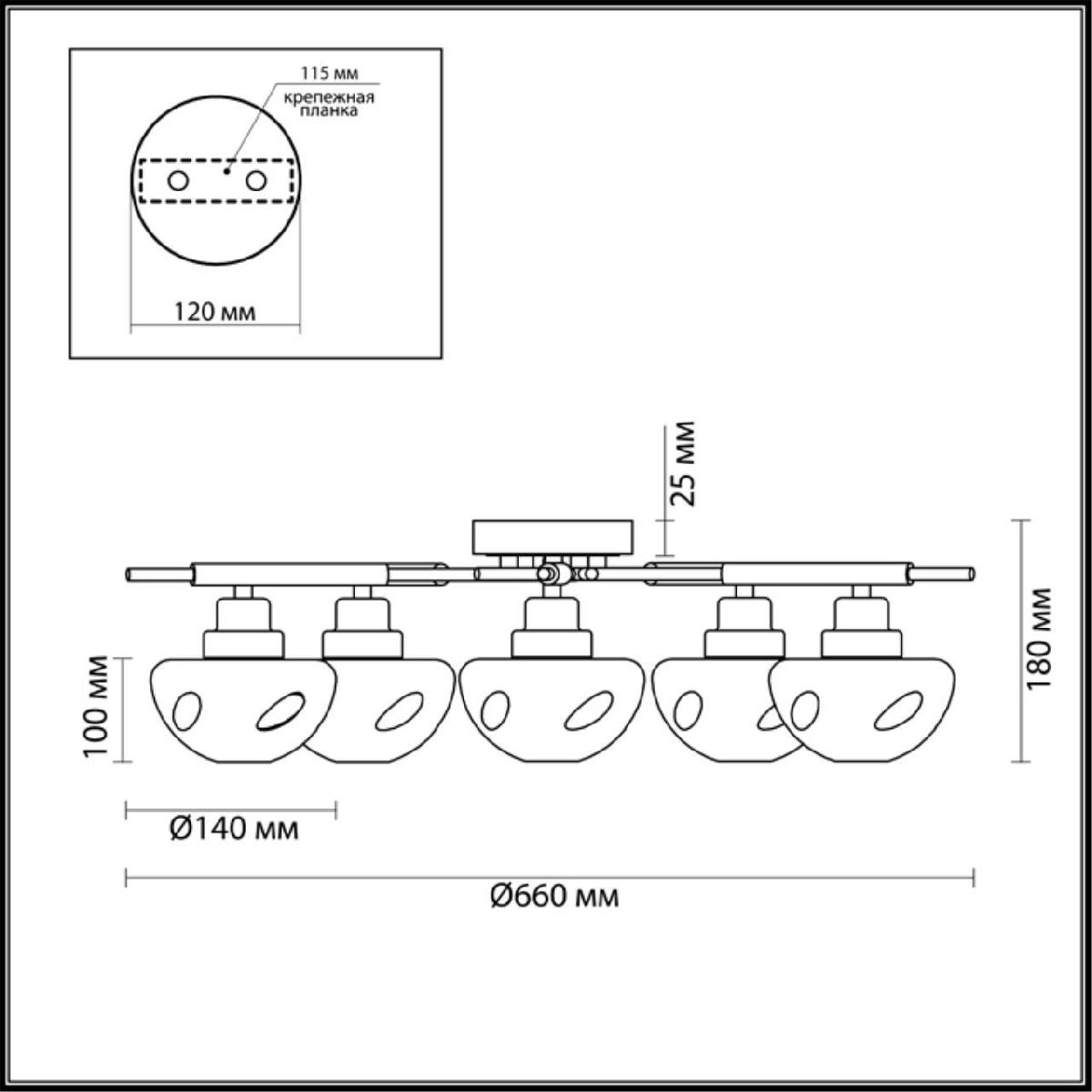 Производитель светильника рекомендует для устройства 5 ламп накаливания с цоколем E14 и мощностью 40 W, что позволит осветить помещение площадью 11,1 кв.м. Габариты изделия: высота – 180 мм, диаметр – 660 мм.