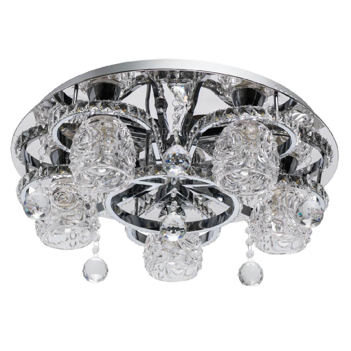 Производитель светильника рекомендует для устройства 5 светодиодных ламп с цоколем E14 и мощностью 40 W, что позволит осветить помещение площадью 23,9 кв.м. Габариты изделия: высота – 180 мм, диаметр – 500 мм.