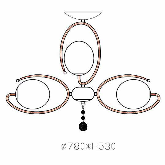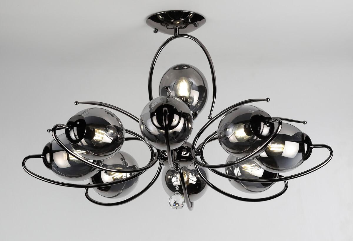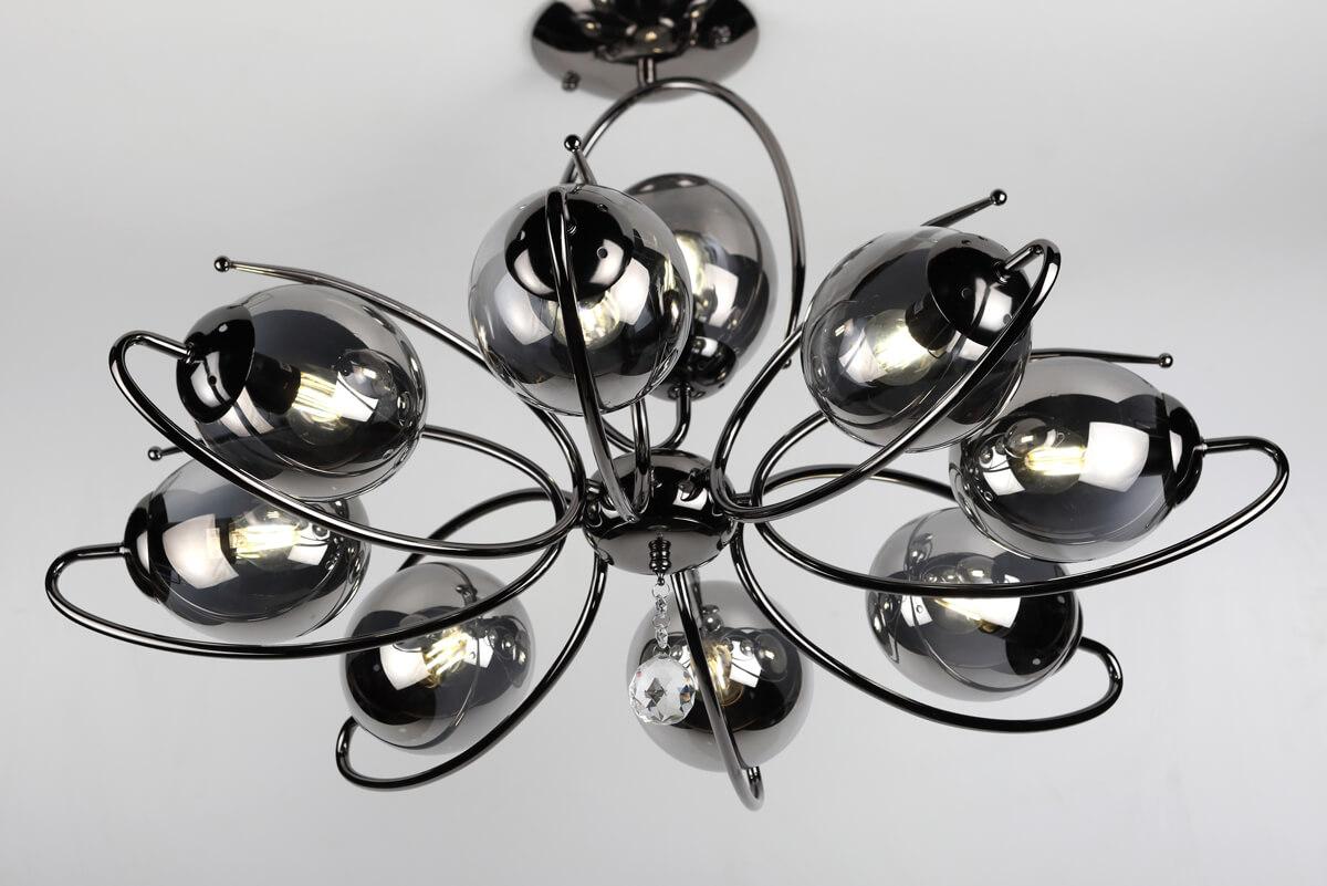 Производитель светильника рекомендует для устройства 9 ламп накаливания с цоколем E14 и мощностью 40 W, что позволит осветить помещение площадью 36 кв.м. Габариты изделия: высота – 530 мм, диаметр – 780 мм.