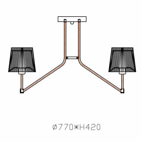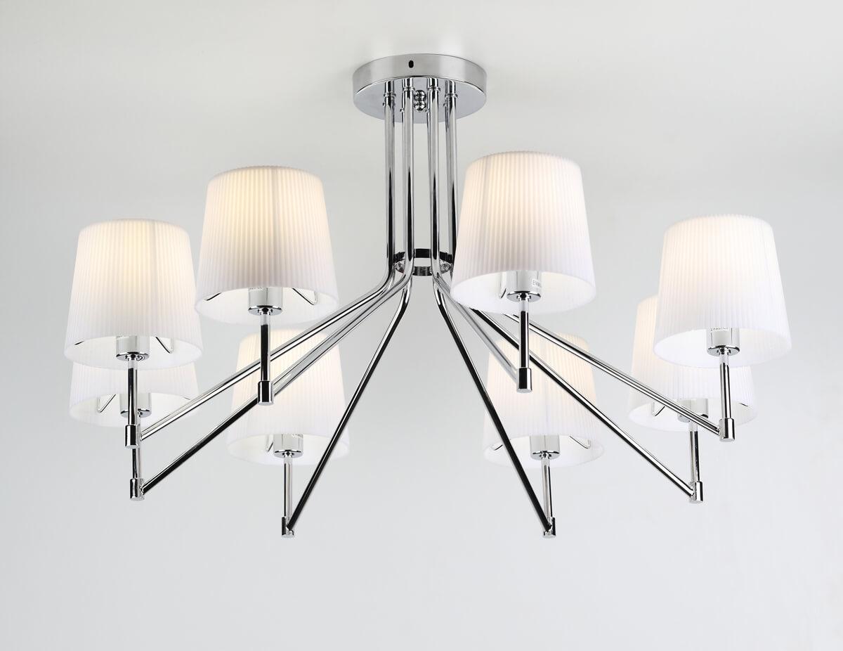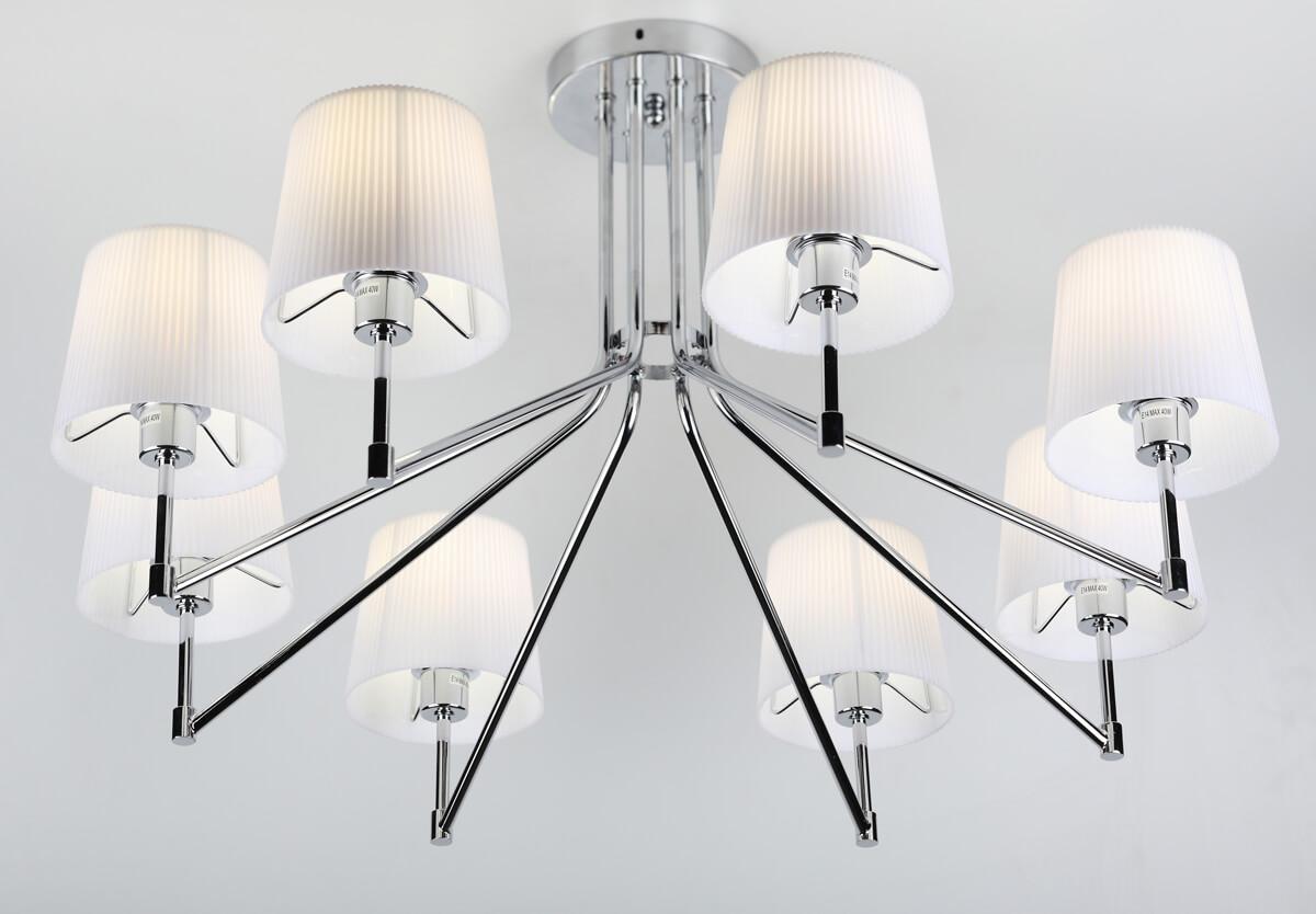 Производитель светильника рекомендует для устройства 8 ламп накаливания с цоколем E14 и мощностью 40 W, что позволит осветить помещение площадью 32 кв.м. Габариты изделия: высота – 420 мм, диаметр – 770 мм.