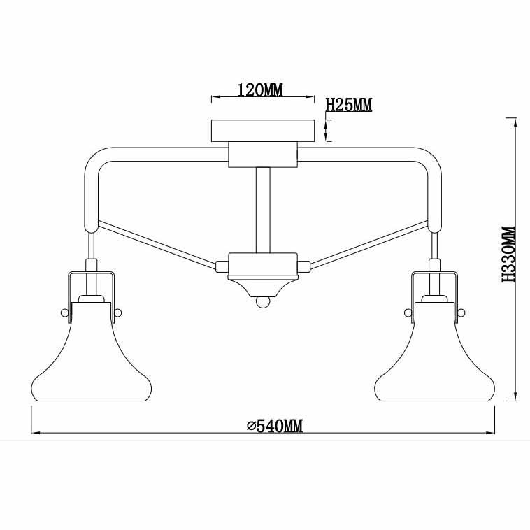 Производитель светильника рекомендует для устройства 3 лампы накаливания с цоколем E14 и мощностью 40 W, что позволит осветить помещение площадью 12 кв.м. Габариты изделия: высота – 330 мм, диаметр – 540 мм.