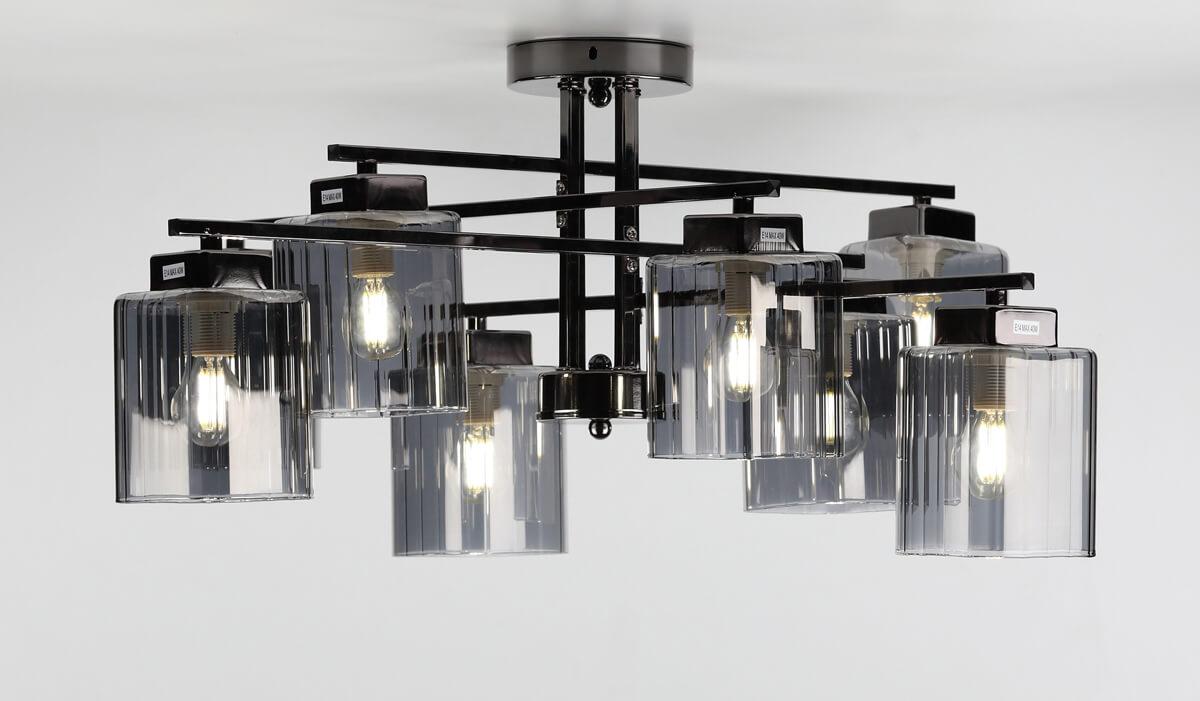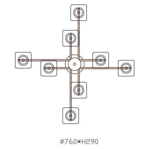 Производитель светильника рекомендует для устройства 8 ламп накаливания с цоколем E14 и мощностью 40 W, что позволит осветить помещение площадью 32 кв.м. Габариты изделия: высота – 290 мм, диаметр – 760 мм.