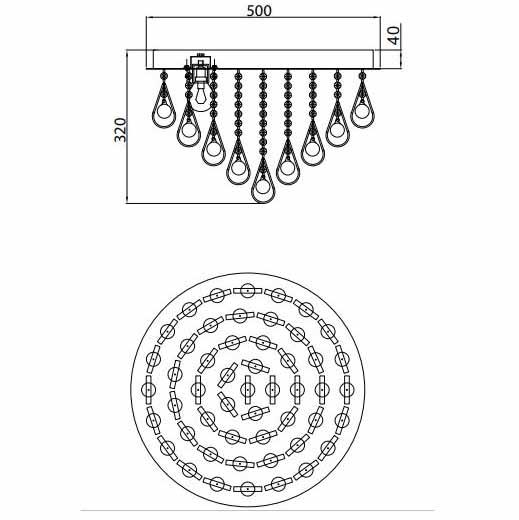 Производитель светильника рекомендует для устройства светодиодных ламп с цоколем LED и мощностью 40 W, что позволит осветить помещение площадью 24 кв.м. Габариты изделия: высота – 500 мм, диаметр – 500 мм.
