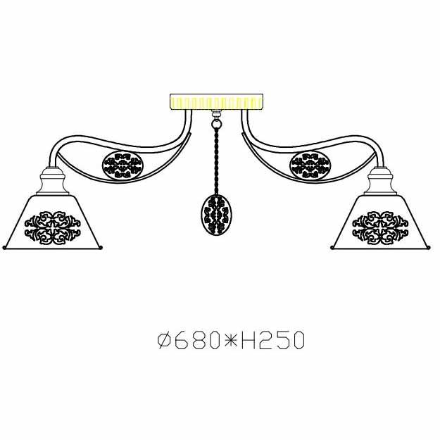 Производитель светильника рекомендует для устройства 5 ламп накаливания с цоколем E14 и мощностью 40 W, что позволит осветить помещение площадью 20 кв.м. Габариты изделия: высота – 250 мм, диаметр – 680 мм.