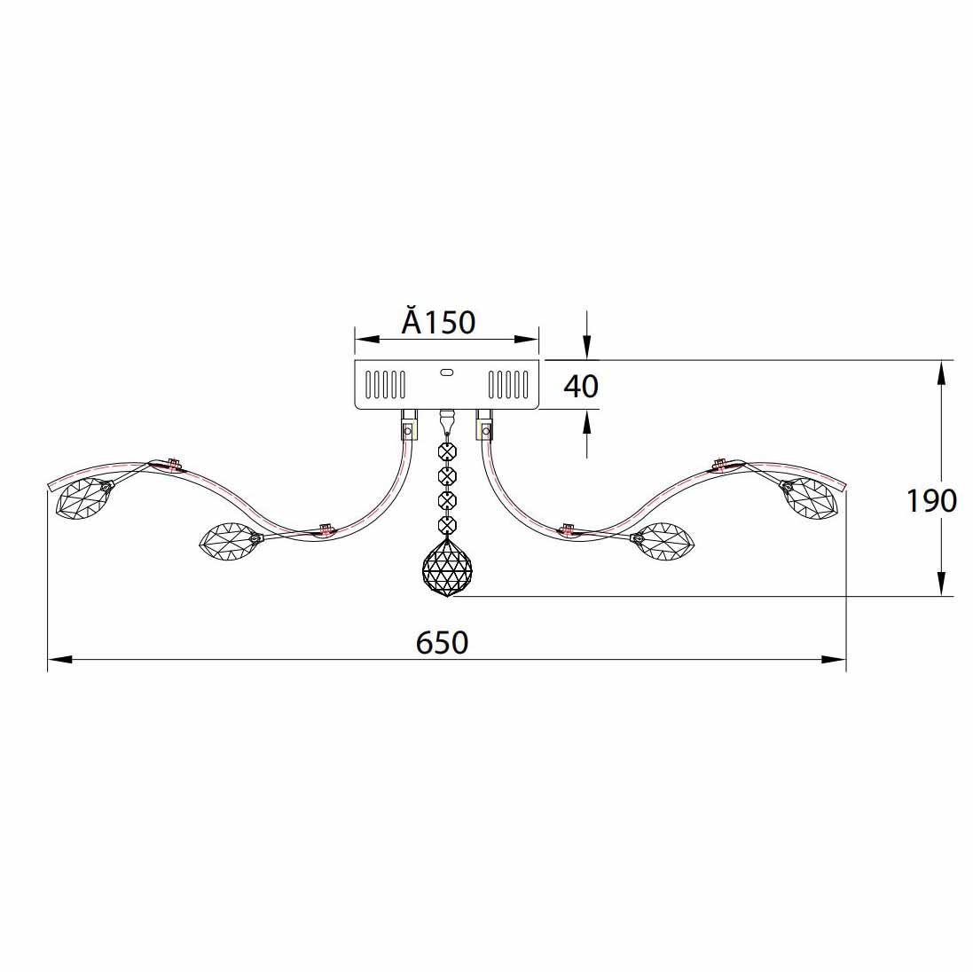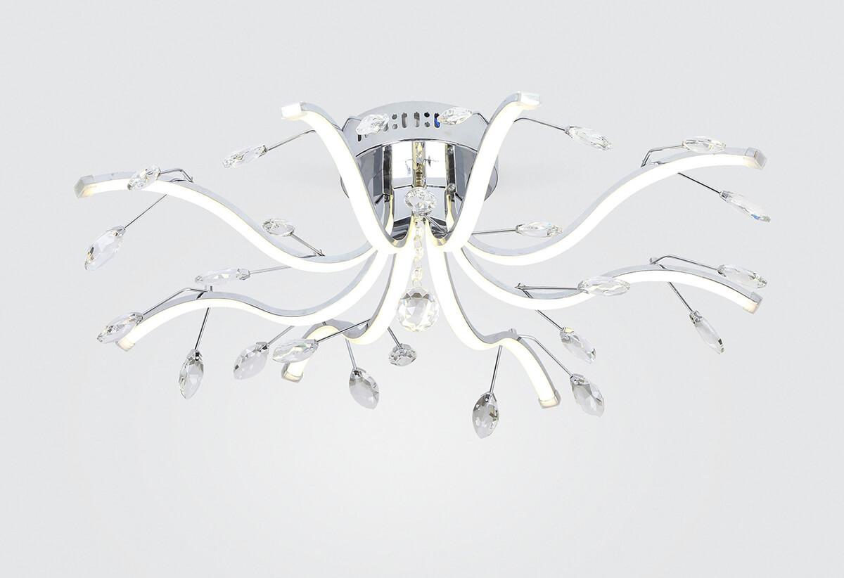 Производитель светильника рекомендует для устройства светодиодных ламп с цоколем LED и мощностью 56 W, что позволит осветить помещение площадью 28 кв.м. Габариты изделия: высота – 650 мм, диаметр – 650 мм.