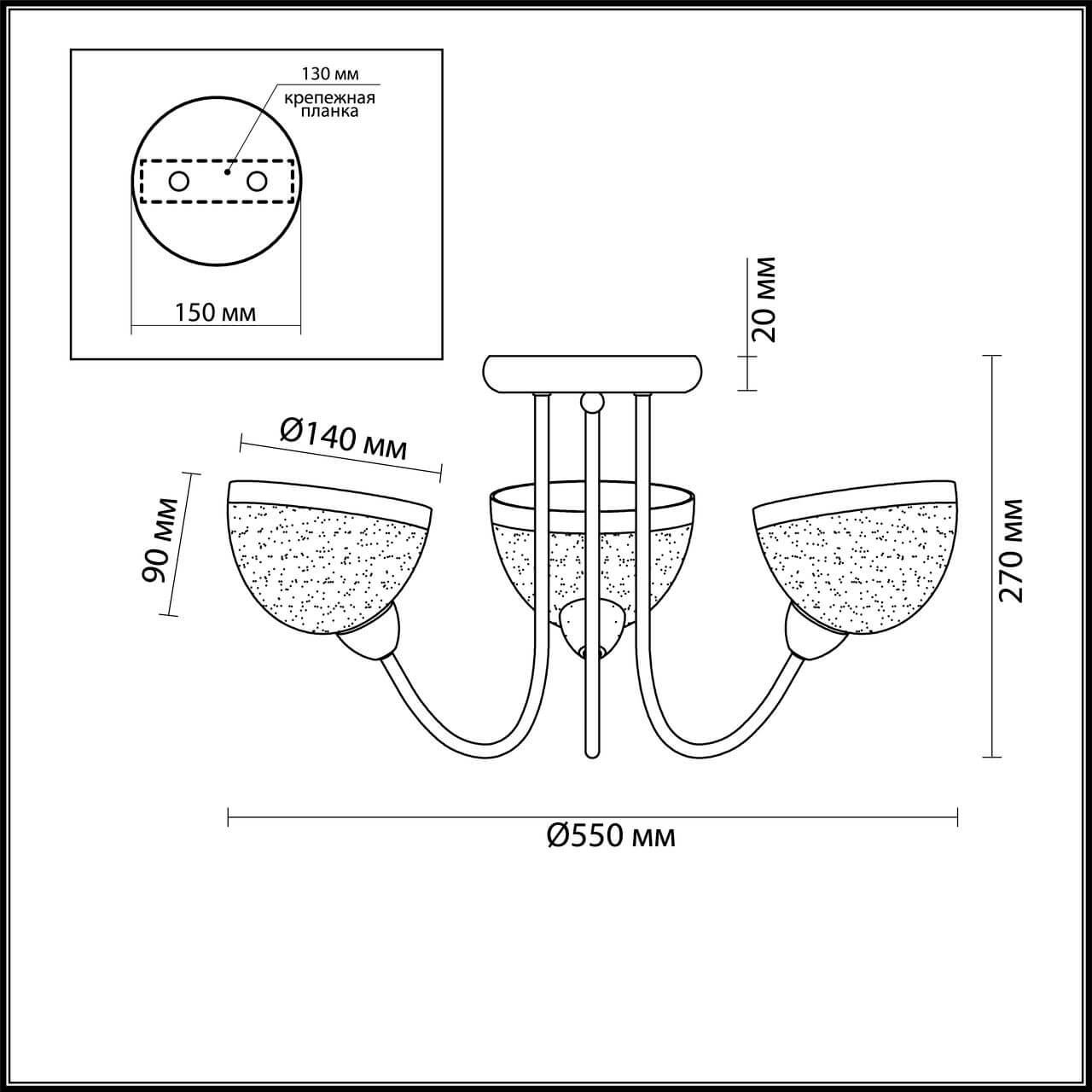 Производитель светильника рекомендует для устройства 3 лампы накаливания с цоколем E14 и мощностью 60 W, что позволит осветить помещение площадью кв.м. Габариты изделия: высота – 270 мм, диаметр – 550 мм.