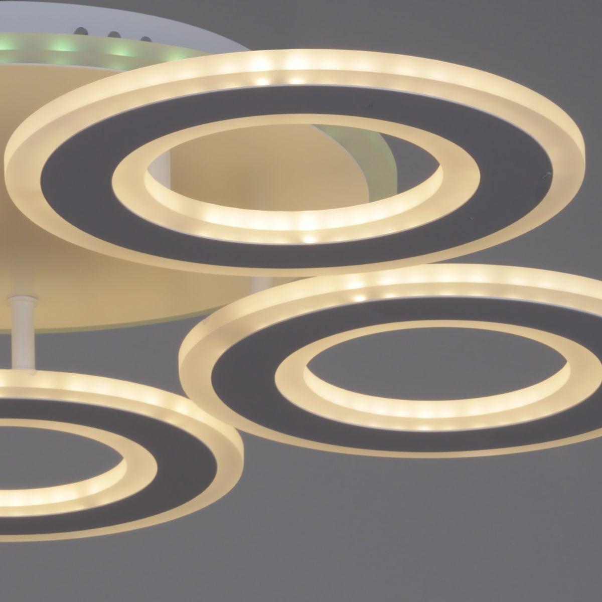Производитель светильника рекомендует для устройства светодиодных ламп с цоколем LED и мощностью 114 W, что позволит осветить помещение площадью 20 кв.м. Габариты изделия: высота – 90 мм, диаметр – 530 мм.