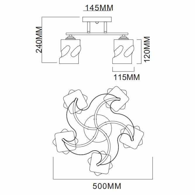 Производитель светильника рекомендует для устройства 5 ламп накаливания с цоколем E27 и мощностью 40 W, что позволит осветить помещение площадью 14 кв.м. Габариты изделия: высота – 240 мм, диаметр – 500 мм.