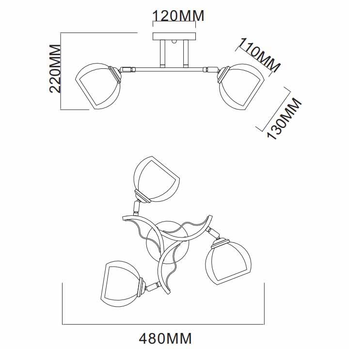 Производитель светильника рекомендует для устройства 3 лампы накаливания с цоколем E27 и мощностью 40 W, что позволит осветить помещение площадью 10 кв.м. Габариты изделия: высота – 220 мм, диаметр – 480 мм.