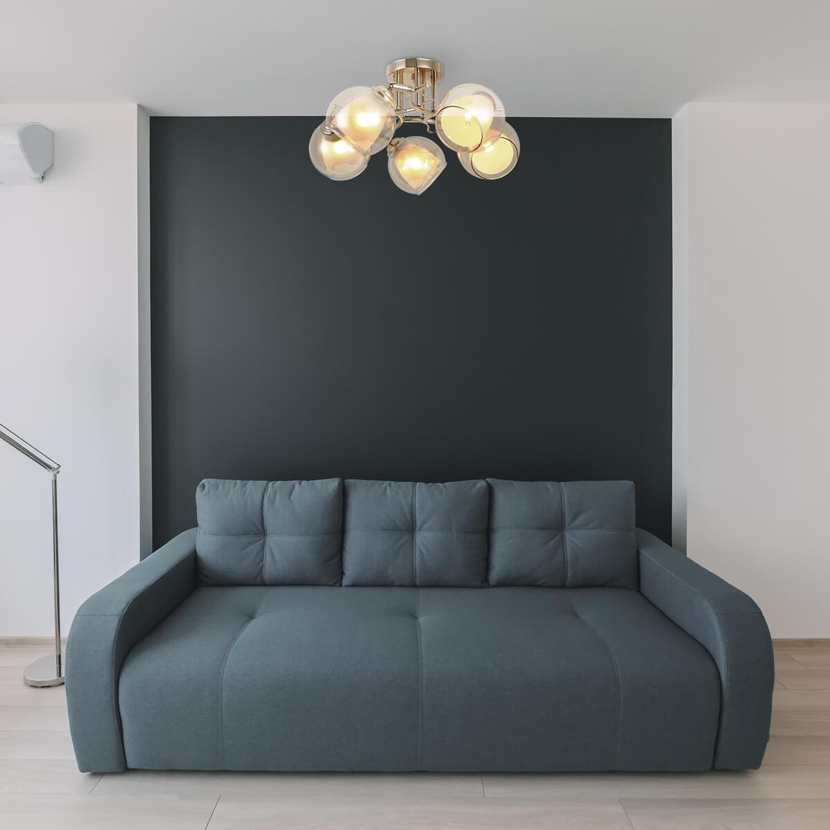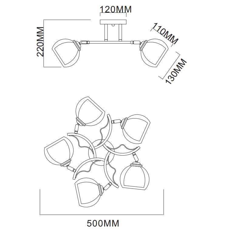 Производитель светильника рекомендует для устройства 5 ламп накаливания с цоколем E27 и мощностью 40 W, что позволит осветить помещение площадью 14 кв.м. Габариты изделия: высота – 220 мм, диаметр – 500 мм.