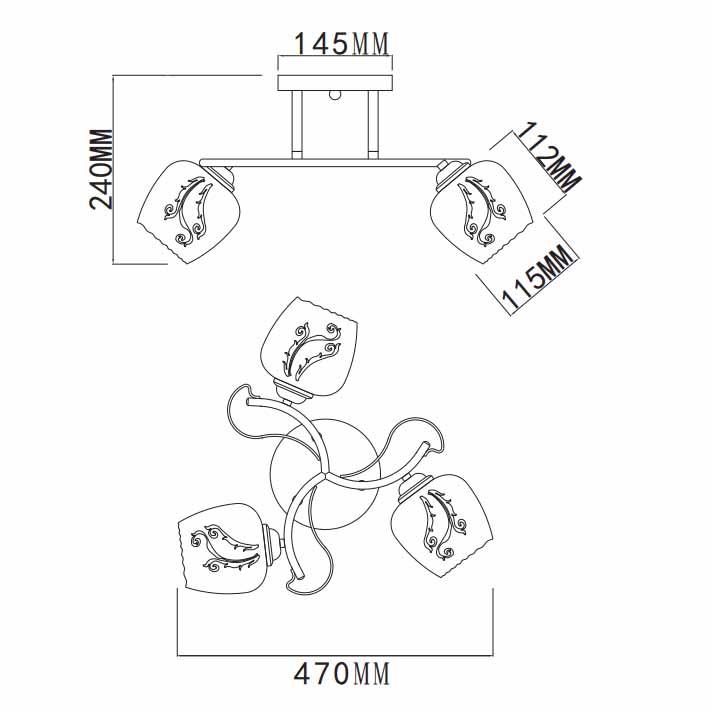 Производитель светильника рекомендует для устройства 3 лампы накаливания с цоколем E27 и мощностью 40 W, что позволит осветить помещение площадью 10 кв.м. Габариты изделия: высота – 240 мм, диаметр – 470 мм.