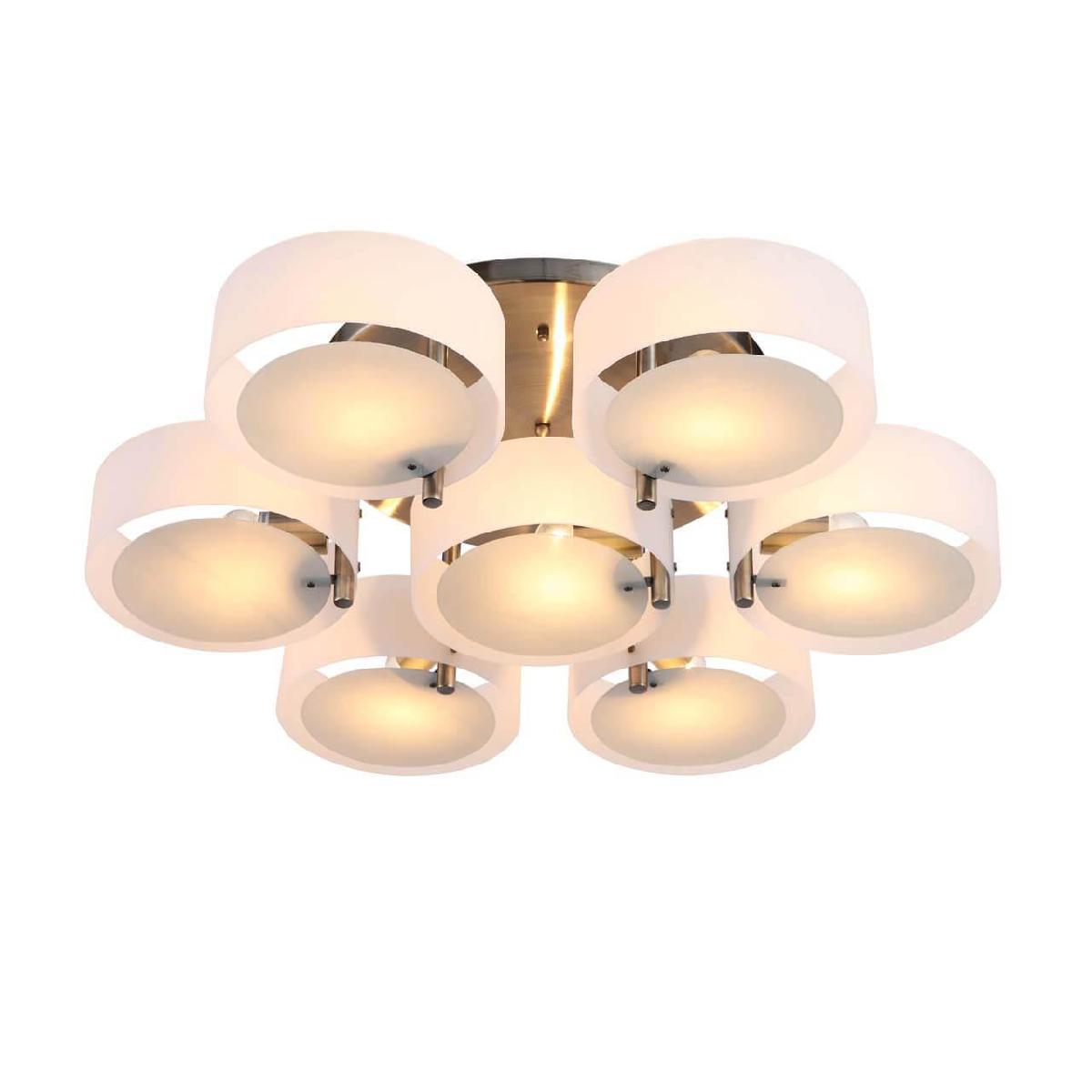Производитель светильника рекомендует для устройства 7 ламп накаливания с цоколем E27 и мощностью 60 W, что позволит осветить помещение площадью 23 кв.м. Габариты изделия: высота – 200 мм, диаметр – 900 мм.