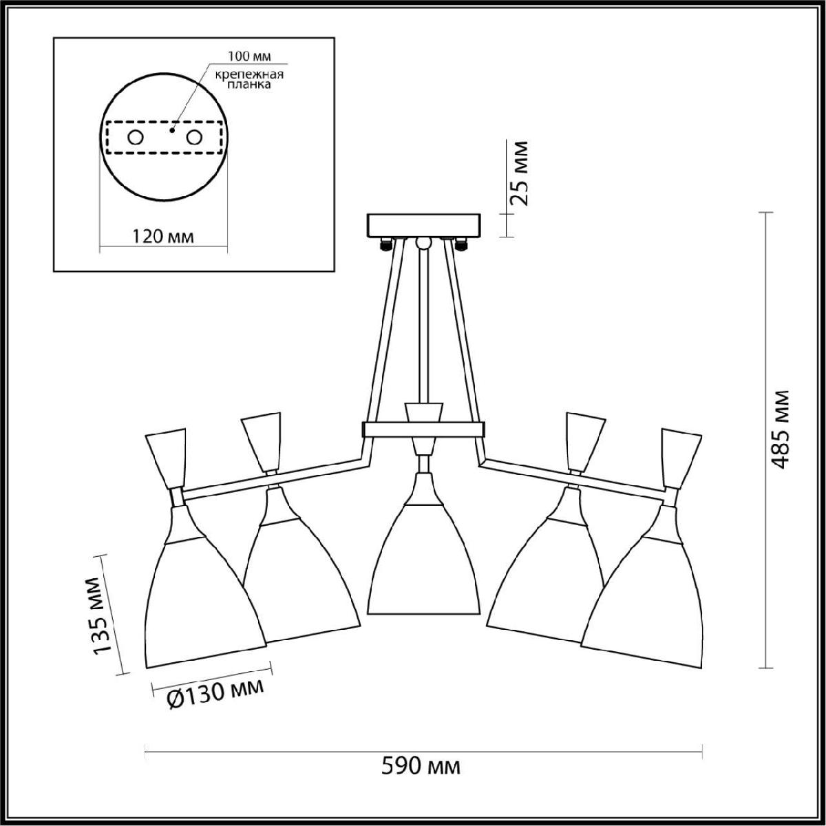 Производитель светильника рекомендует для устройства 5 ламп накаливания с цоколем E14 и мощностью 60 W, что позволит осветить помещение площадью 16,7 кв.м. Габариты изделия: высота – 485 мм, диаметр – 590 мм.