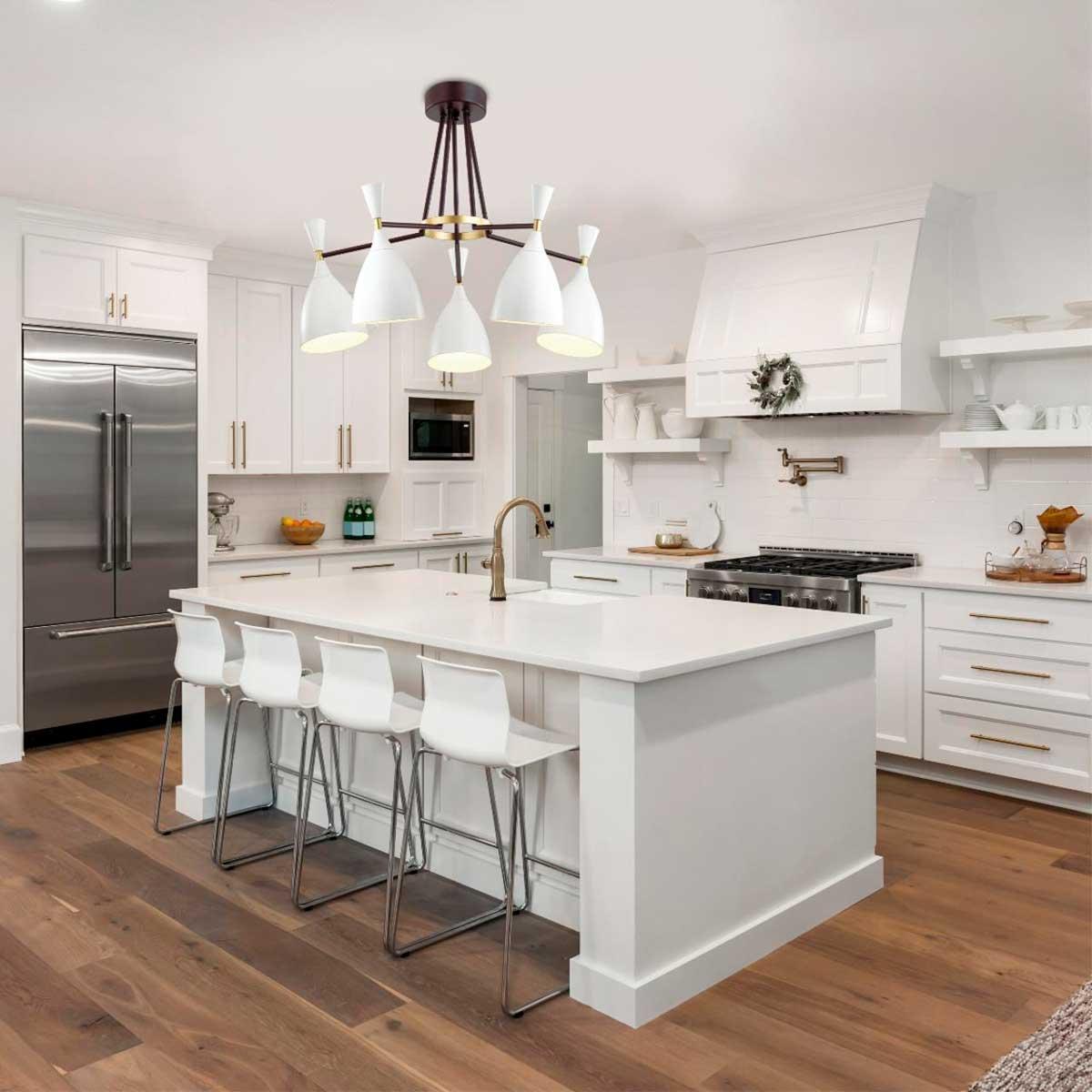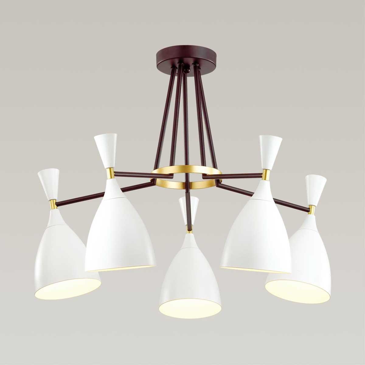 Потолочная люстра Lumion Oliver 4494/5C от Итальянского бренда Lumion из коллекции Oliver будет удачно смотреться в кухне в дизайнерском стиле. Светильник выполнен из металла с плафонами в форме конуса белого цвета.