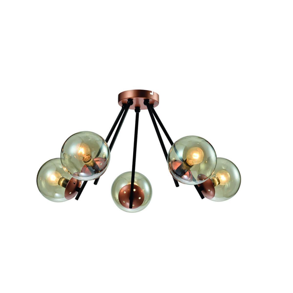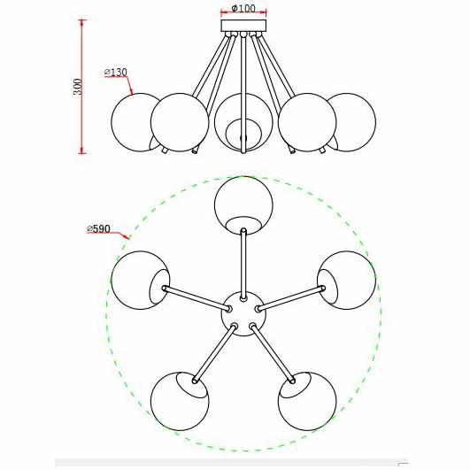 Производитель светильника рекомендует для устройства 5 ламп накаливания с цоколем E14 и мощностью 40 W, что позволит осветить помещение площадью 14 кв.м. Габариты изделия: высота – 300 мм, диаметр – 590 мм.