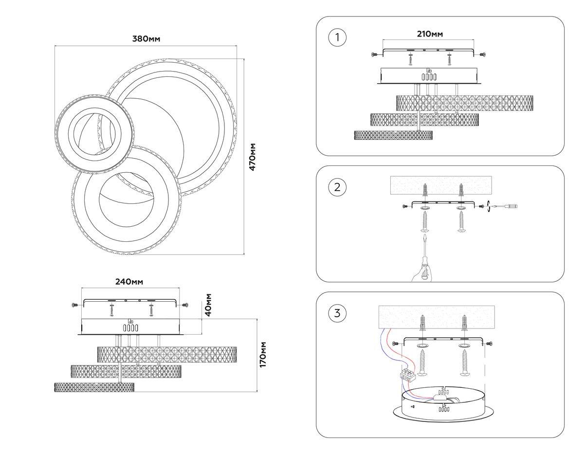 Производитель светильника рекомендует для устройства 3 светодиодные лампы с цоколем LED и мощностью 38 W, что позволит осветить помещение площадью 14 кв.м. Габариты изделия: высота – 170 мм, диаметр – мм.