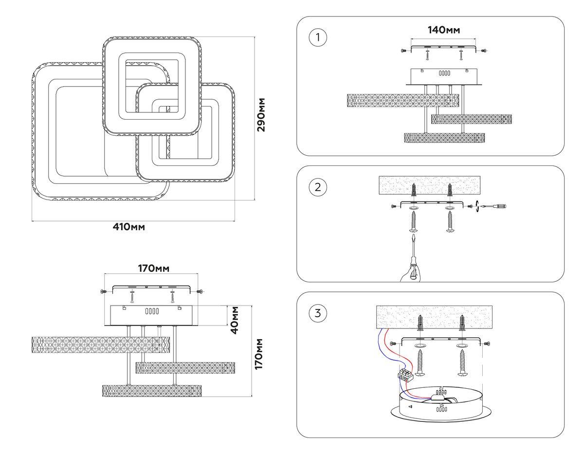 Производитель светильника рекомендует для устройства 3 светодиодные лампы с цоколем LED и мощностью 62 W, что позволит осветить помещение площадью 12 кв.м. Габариты изделия: высота – 170 мм, диаметр – мм.