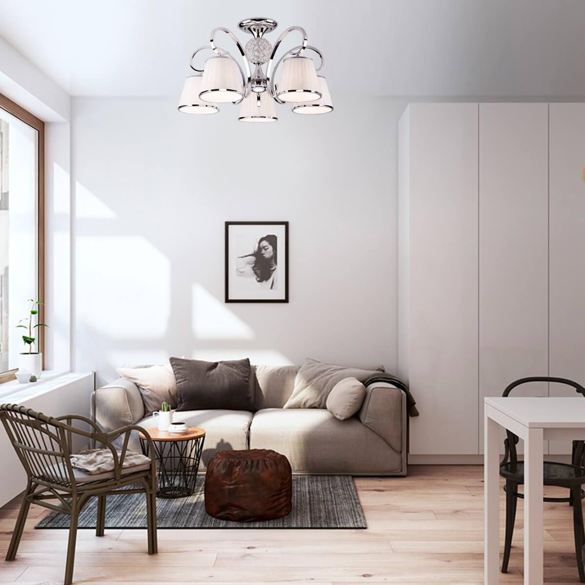 Потолочная люстра Eurosvet 60088/5 хром от Китайского бренда из коллекции Tessa будет удачно смотреться в спальни в неоклассическом стиле. Светильник выполнен из ткани с плафонами в форме белого цвета.