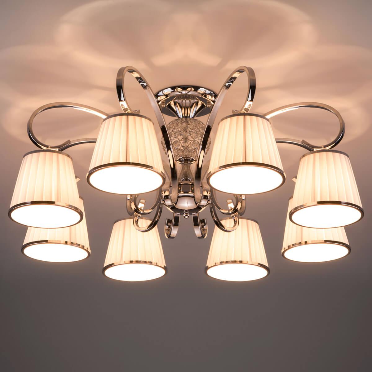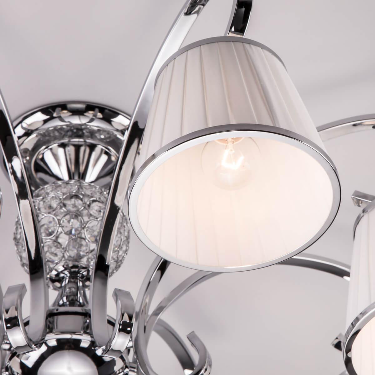 Потолочная люстра Eurosvet 60088/8 хром от Китайского бренда из коллекции Tessa будет удачно смотреться в гостиной в неоклассическом стиле. Светильник выполнен из ткани с плафонами в форме белого цвета.
