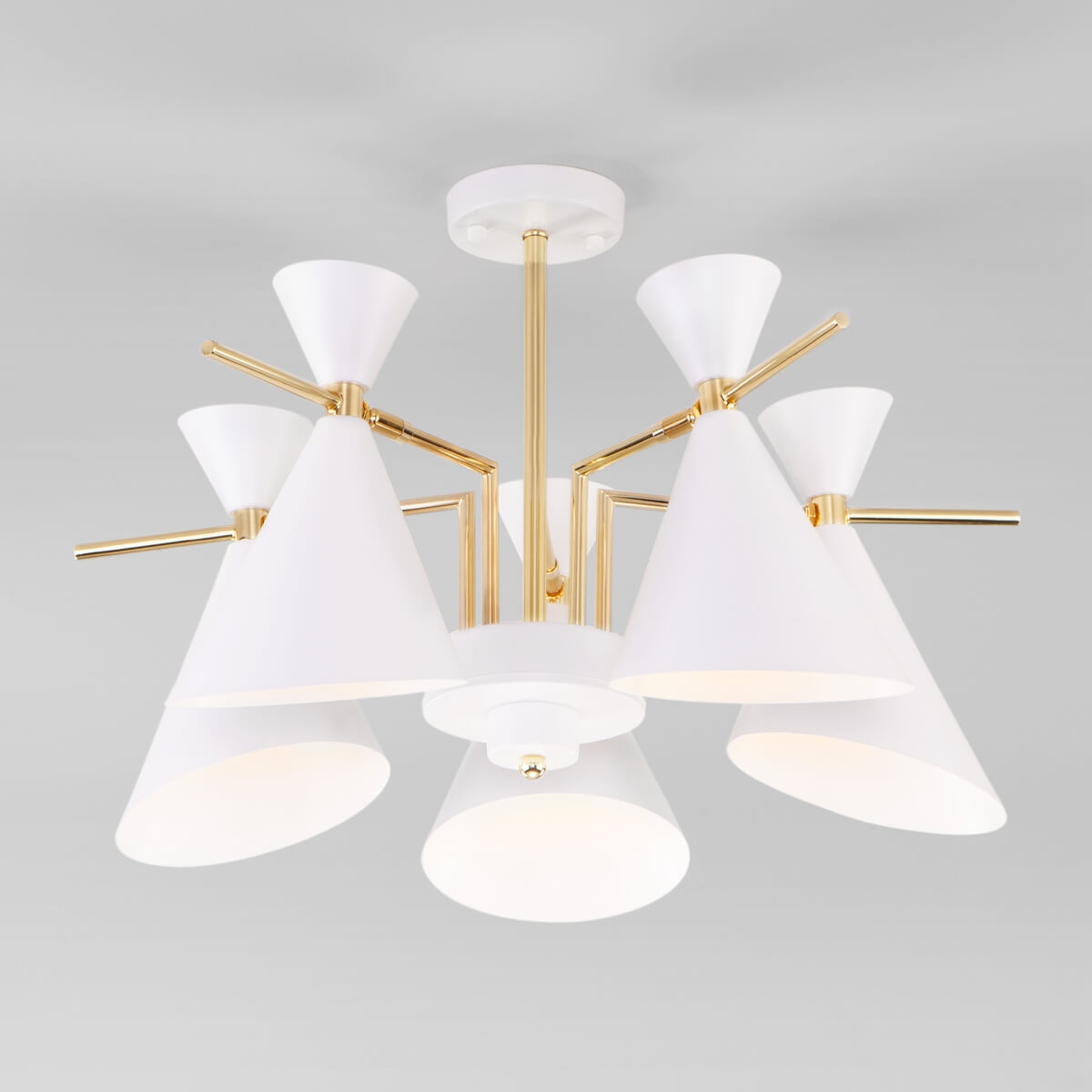 Потолочная люстра Eurosvet Apart 70114/5 белый от Китайского бренда из коллекции Apart будет удачно смотреться в кухне в скандинавском стиле. Светильник выполнен из металла с плафонами в форме белого цвета.