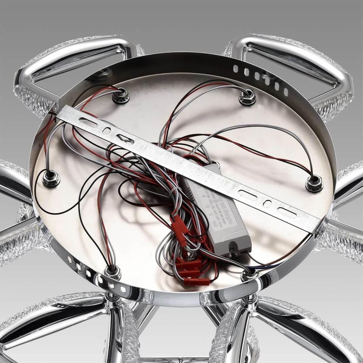Производитель светильника рекомендует для устройства 9 светодиодных ламп с цоколем LED и мощностью 120 W, что позволит осветить помещение площадью 24 кв.м. Габариты изделия: высота – 150 мм, диаметр – 530 мм.