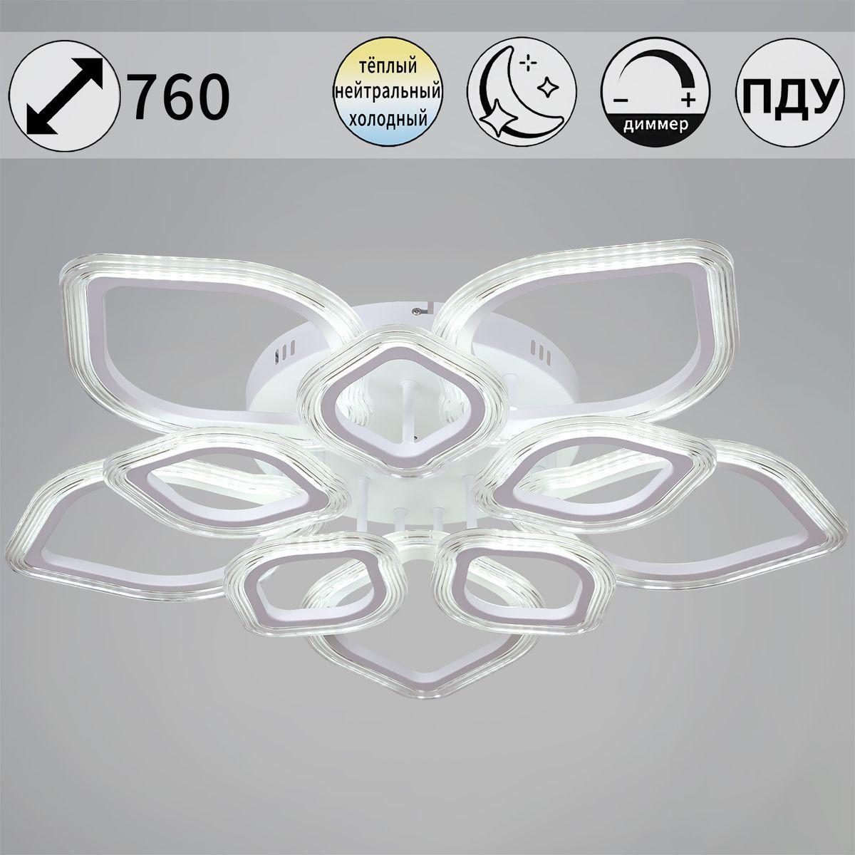 Производитель светильника рекомендует для устройства светодиодных ламп с цоколем LED и мощностью 170 W, что позволит осветить помещение площадью 30 кв.м. Габариты изделия: высота – 120 мм, диаметр – 760 мм.