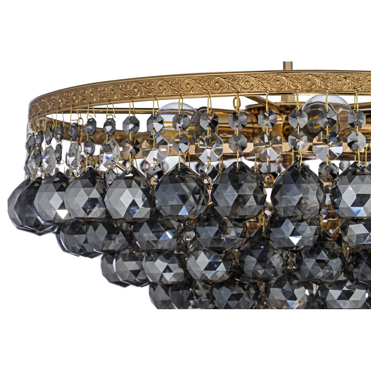 Потолочная люстра Arti Lampadari Castellana E 1.3.46.603 G от Итальянского бренда из коллекции Castellana Gold будет удачно смотреться в спальни в классиком стиле. Светильник выполнен из хрусталя с плафонами в форме дымчатого цвета.