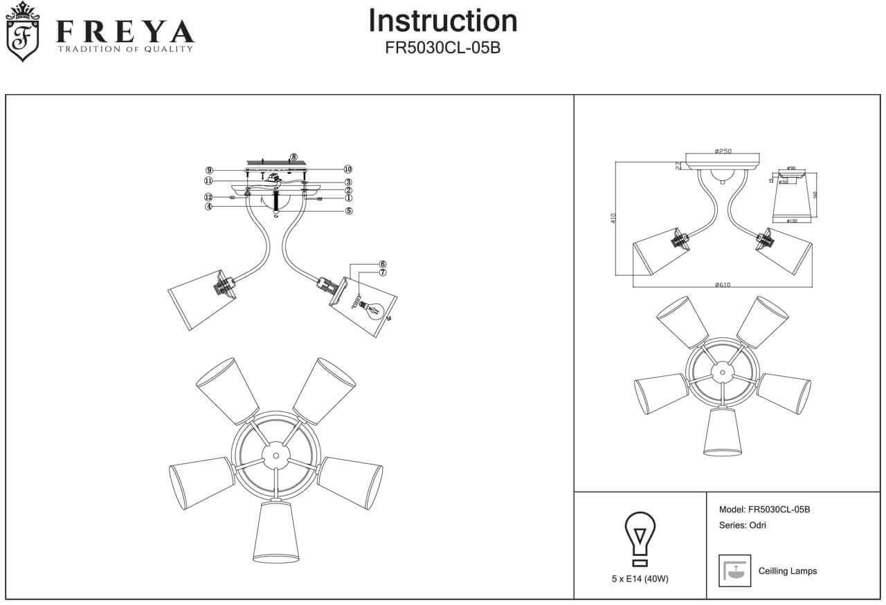 Производитель светильника рекомендует для устройства 5 ламп накаливания с цоколем E14 и мощностью 40 W, что позволит осветить помещение площадью кв.м. Габариты изделия: высота – 410 мм, диаметр – 610 мм.