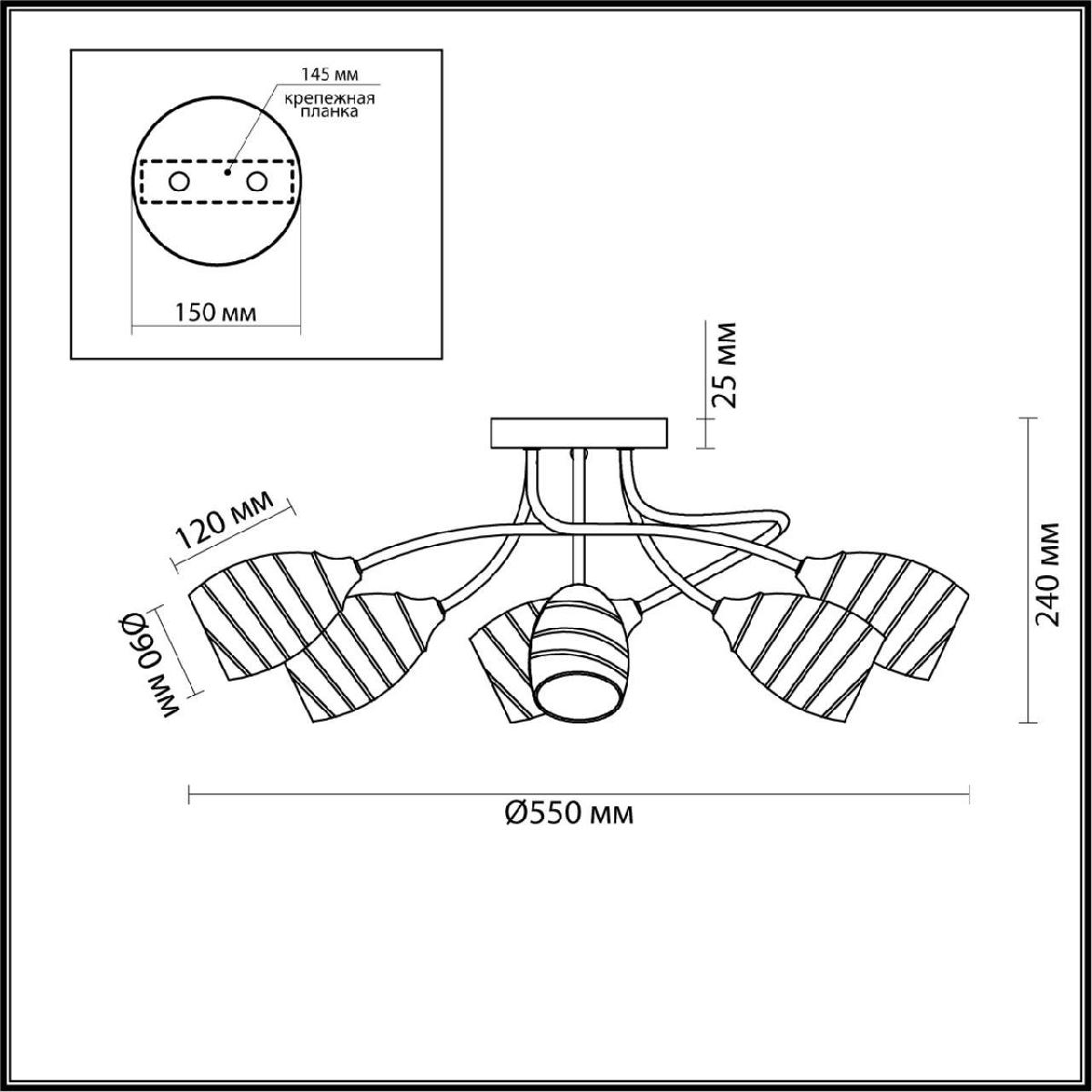 Производитель светильника рекомендует для устройства 6 ламп накаливания с цоколем E27 и мощностью 60 W, что позволит осветить помещение площадью 20 кв.м. Габариты изделия: высота – 240 мм, диаметр – 550 мм.