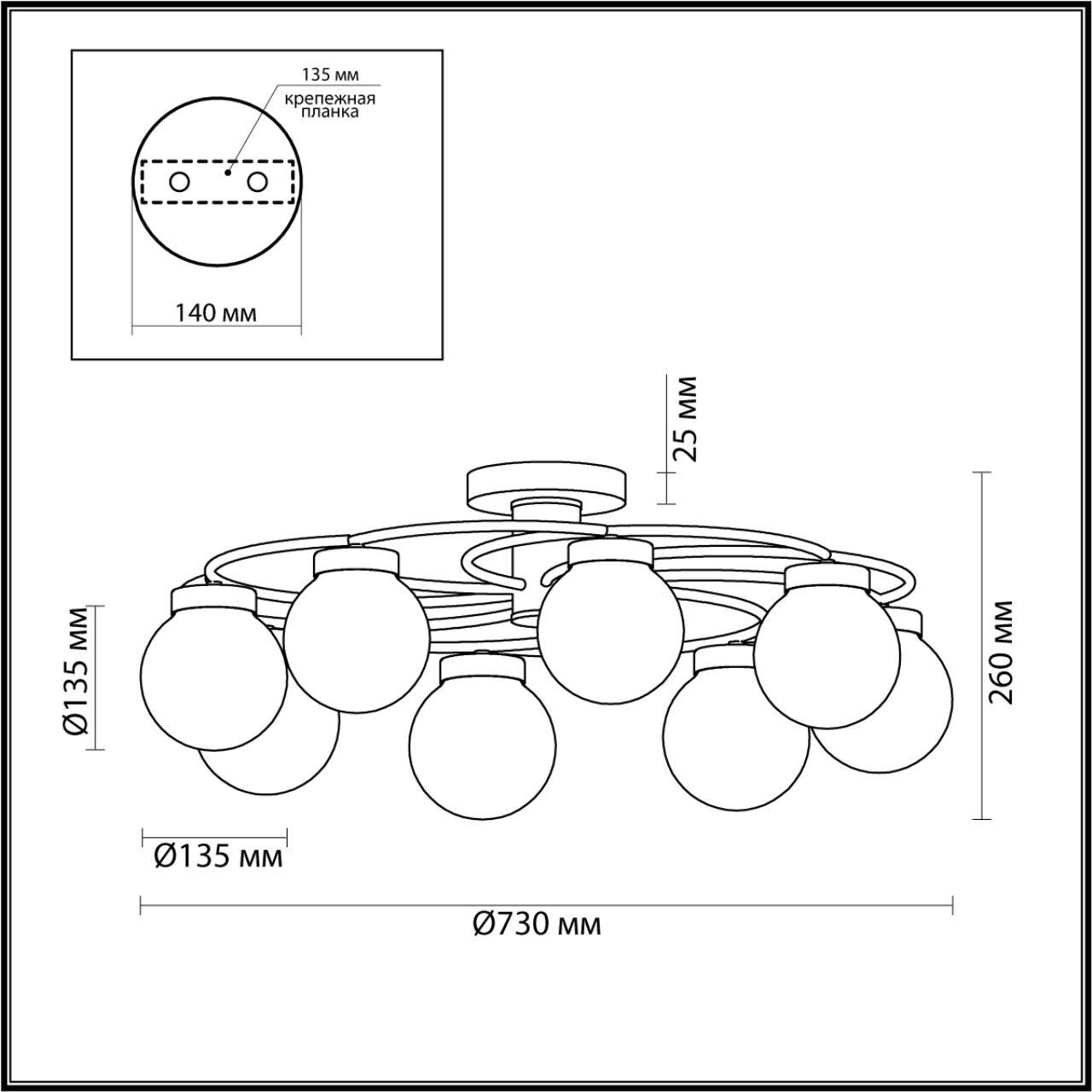 Производитель светильника рекомендует для устройства 8 ламп накаливания с цоколем E14 и мощностью 40 W, что позволит осветить помещение площадью кв.м. Габариты изделия: высота – 260 мм, диаметр – 730 мм.