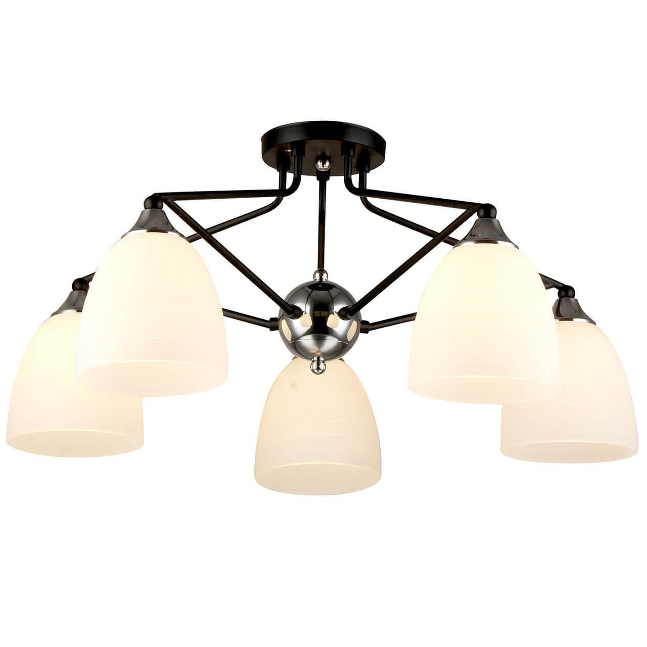 Производитель светильника рекомендует для устройства 5 ламп накаливания с цоколем E27 и мощностью 60 W, что позволит осветить помещение площадью 16,7 кв.м. Габариты изделия: высота – 285 мм, диаметр – 630 мм.