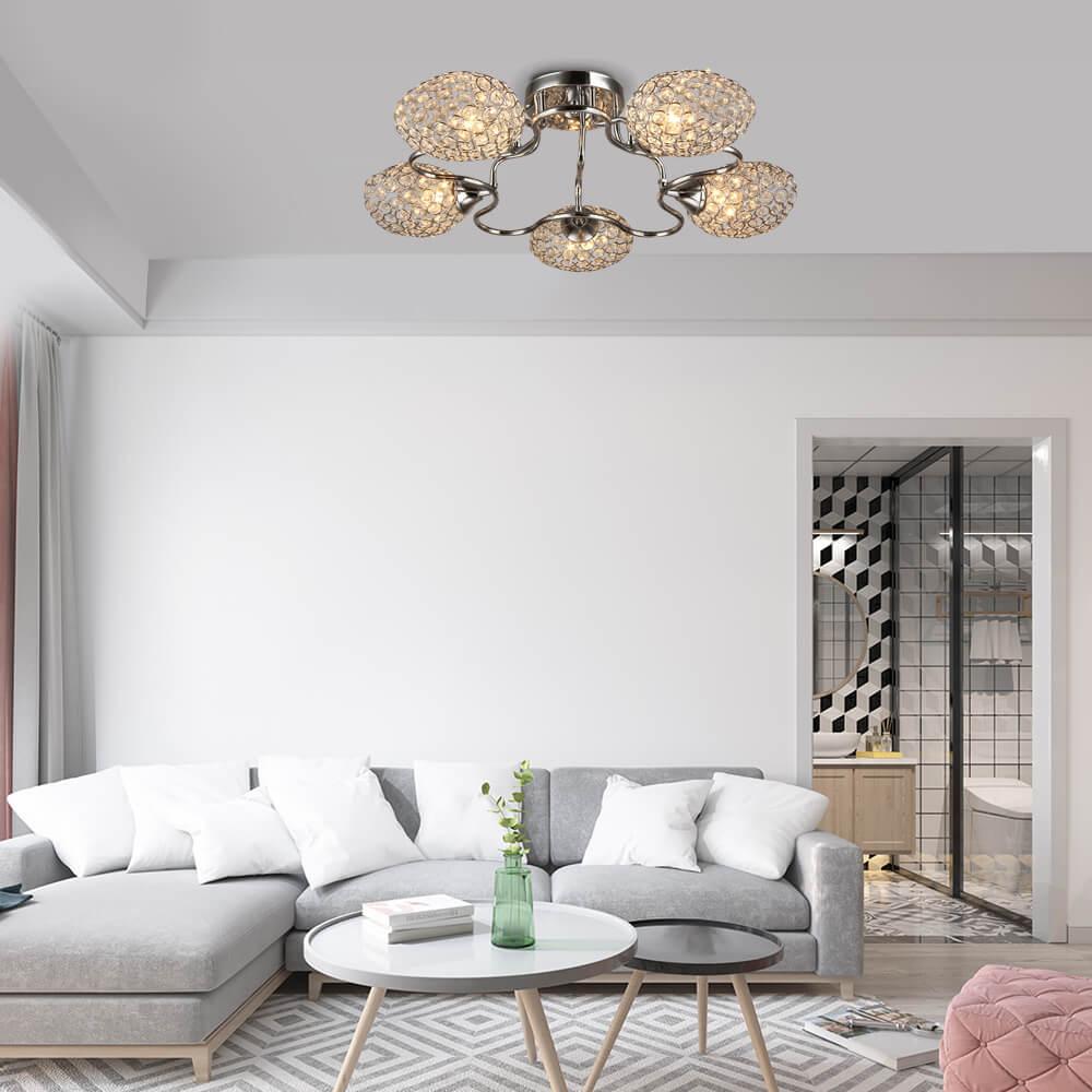 Производитель светильника рекомендует для устройства 5 ламп накаливания с цоколем E27 и мощностью 60 W, что позволит осветить помещение площадью 16,7 кв.м. Габариты изделия: высота – 170 мм, диаметр – 615 мм.