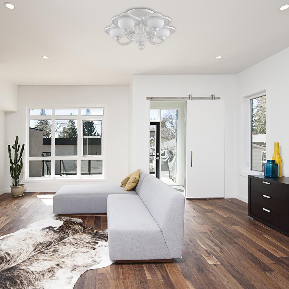 Потолочная люстра Hiper Ronda H804-5 от Китайского бренда Hiper из коллекции Ronda будет удачно смотреться в гостиной в современном стиле. Светильник выполнен из стекла с плафонами в форме круга белого цвета.