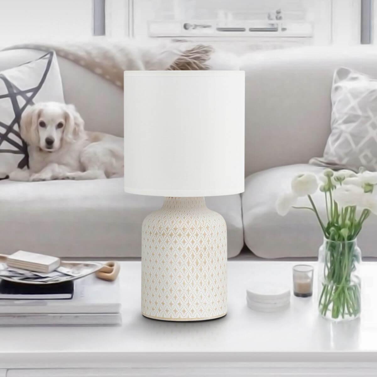 Настольная лампа Rivoli Sabrina 7043-502 Б0053462 от Китайского бренда из коллекции Sabrina ) подходит для установки на стол в гостиной в ретро стиле. Лампа из керамической основы - белого цвета и плафонами из ткани в форме - белого цвета.