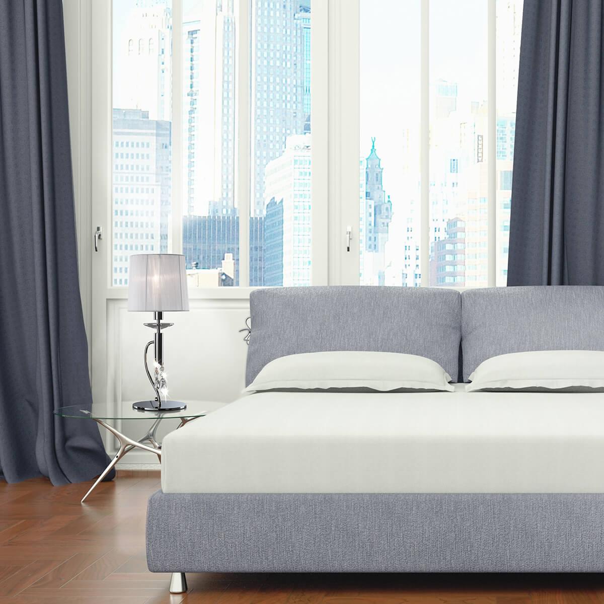 Настольная лампа Mantra Tiffany 3868 от Китайского бренда Mantra из коллекции Tiffany ) подходит для установки на стол в спальни в дизайнерском стиле. Лампа из металлической основы - цвет хрома и плафонами из органзы в форме конуса - белого цвета.